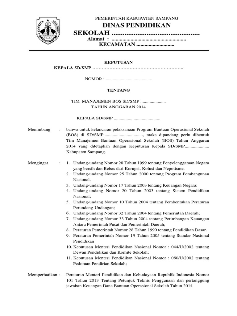 Contoh Sk Tim Bos Sekolah Semua Jenjang Pendidikan Tahun 2020 2021 Bingkai Guru from 3.bp.blogspot.com Dalam penyusunannya sk tim bos sekolah merupakan kewenangan kepala sekolah, tetapi susunan atau struktur keanggotaan tim bos sekolah sudah ditentukan dalam. Contoh sk tim bos reguler sekolah terbaru 2021 (format word) untuk mengelola dana bos yang diterima lembaga, kepala sekolah wajib membuat sk tim bos. Sk tim bos sekolah yaitu dokumen atau administrasi yang perlu di buat dalam pengelolaan danabos di tingkat sd, smp, sma dan smk tahun 2020. Download sk tim bos sekolah tingkat sd, smp, sma tahun 2019. Contoh sk tim bos sekolah 2014 mohammad rifai. Sk ini merupakan pengganti dari sk tim manajeman bos yang selalu diterbitkan pada tiap tahun anggaran. Oleh sebab itu penting bagi sekolah untuk menentukan/membuat struktur keanggotnan tim bos tingkat sekolah dengan mengeluarkan sk penetapan bos reguler. Kepala sekolah 20225680 ahmad ajiji s.ag.
