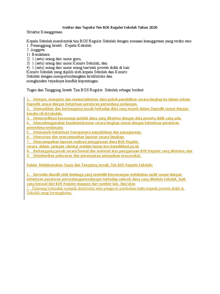 Sk tim bos sekolah yaitu dokumen atau administrasi yang perlu di buat dalam pengelolaan danabos di tingkat sd, smp, sma dan smk tahun 2020. Adapun tugas dan tanggungjawab tim bos yang ditetapkan kepala sekolah terdiri dari 12 butir yaitu: Demikian informasi mengenai struktur dan tupoksi tim bos reguler sekolah tahun 2021, semoga ada manfaatnya. Struktur keanggotaan tim bos reguler sekolah. Tim bos pada tulisan kali ini berdasarkan pada peraturan terbaru, yaitu permendikbud no. Kepala sekolah sd/smp/sma/smk membentuk tim bos sekolah yang terdiri dari penanggung jawab, anggota (terdiri dari bendahara dan 1 orang dari unsur orang tua/ wali murid). Posting komentar untuk struktur dan tupoksi tim bos reguler sekolah tahun 2021 gambar ataupun video yang ada di situs ini terkadang berasal dari berbagai sumber media lain. Bertanggung jawab mutlak terhadap hasil isian data sekolah yang masuk dalam dapodik. Kegiatan dan anggaran sekolah (rkas). Sk (surat keputusan), notulen, serta daftar hadir ini diperlukan untuk kebutuhan dalam rapat penyusunan dan penetapan struktur organisasi sekolah/ madrasah. Struktur tugas pokok dan fungsi tim bantuan operasional (bos) sekolah Hak cipta sepenuhnya dipegang oleh sumber tersebut. Contoh sk tim bos reguler sekolah terbaru 2021 (format word) untuk mengelola dana bos yang diterima lembaga, kepala sekolah wajib membuat sk tim bos.